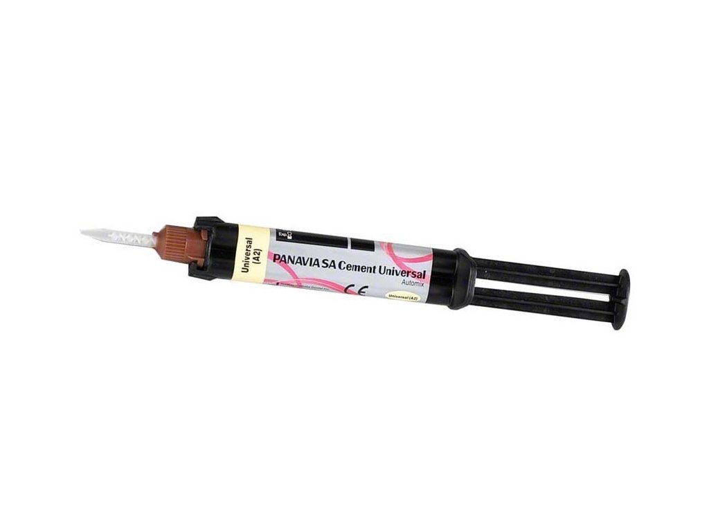 PANAVIA SA Cement Universal je duálně tuhnoucí, fluorid uvolňující, radioopakní, samoadhezivní pryskyřičný cement pro náhrady z keramiky, kompozitních plastů a kovů. Dodává se buď jako Automix (v mísicí kanyle se smísí stejná množství dvou komponent), nebo jako Handmix (stejná množství obou komponent se smísí na míchací destičce).
